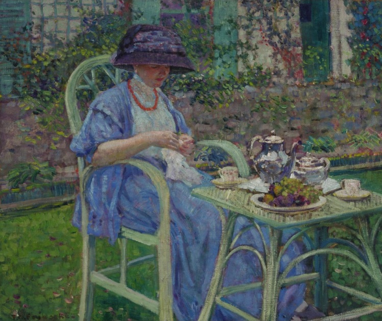 Frederick Carl Frieseke, an America Impressionist painter, and not as well-known as Monet and others, he spent most of his life as an expatriate in France and was a member of the Giverny (Monet) art colony. I enjoy his paintings because they are dappled in sunlight.