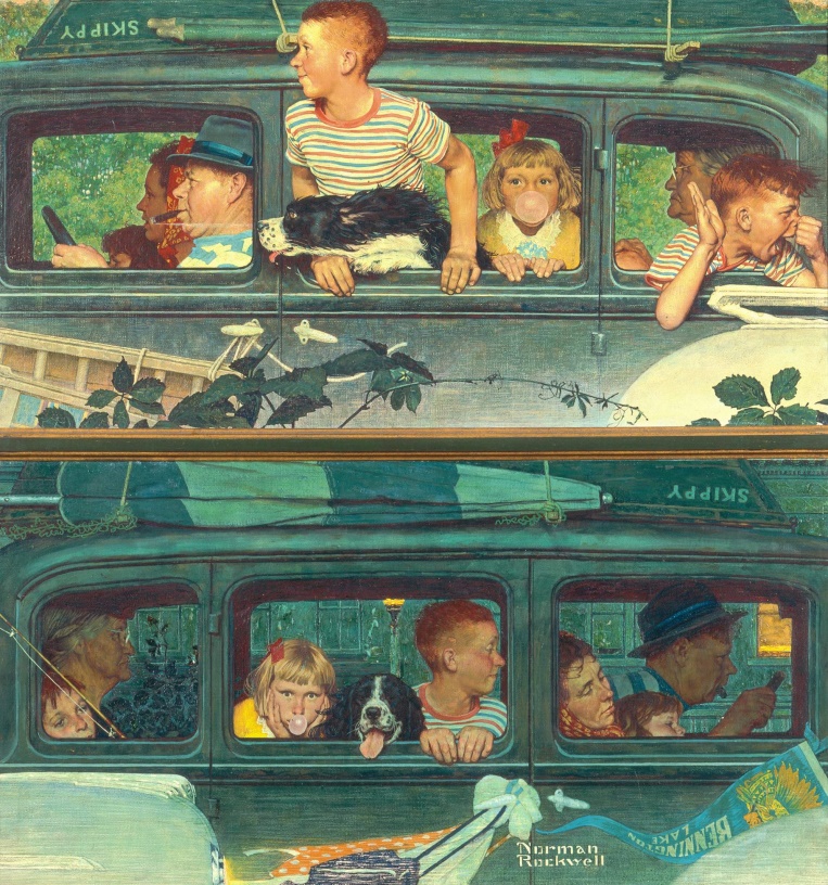 One such trip is portrayed by Rockwell, famous for having his paintbrush on the pulse of the times, on the Saturday Evening Post cover 30 August 1947. One can almost hear the eternal childhood refrain etched in our memories: “Are we there yet?”