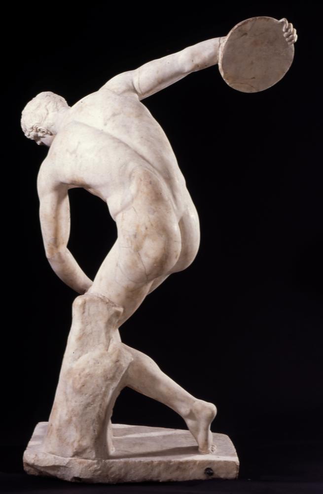 Discobolus–or “discus thrower” is the epitome of fitness! He was originally created in bronze by a sculptor named Myron at the start of the Greek Classical period (460-450 BC). He is a beautiful representation of the athletic ideal and became the iconic image of the Olympic games past and present (London 1948). The original Greek bronze sculpture has been lost, but, thanks to the Romans who loved to copy everything Greek, several Roman-made marble copies are with us today.