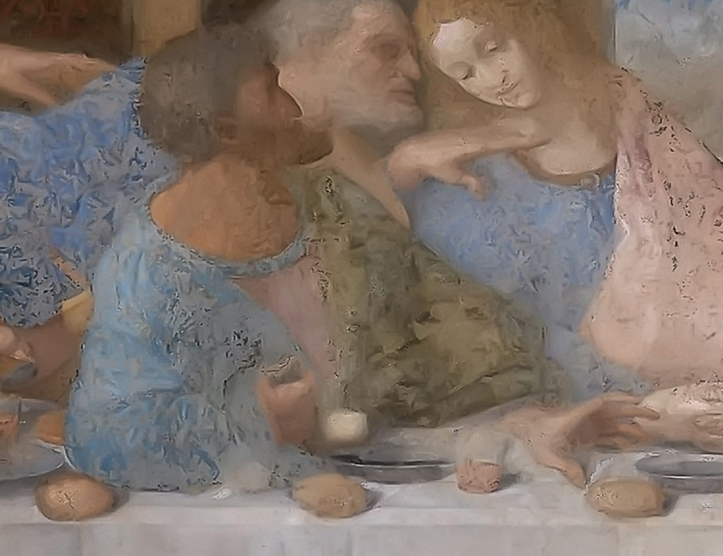 A small section of biblical scholars feels the person depicted in the painting is not actually John the Apostle but rather a woman, possibly Mary Magdalen in disguise. The person is the only one among the apostles who appears to be wearing a pendant or necklace. (Then…where is JOHN?)