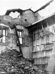 Damage done by the World War II bombings to the refectory surrounding the wall with The Last Supper which had been successfully reinforced by sandbags can be seen in this historic photo.