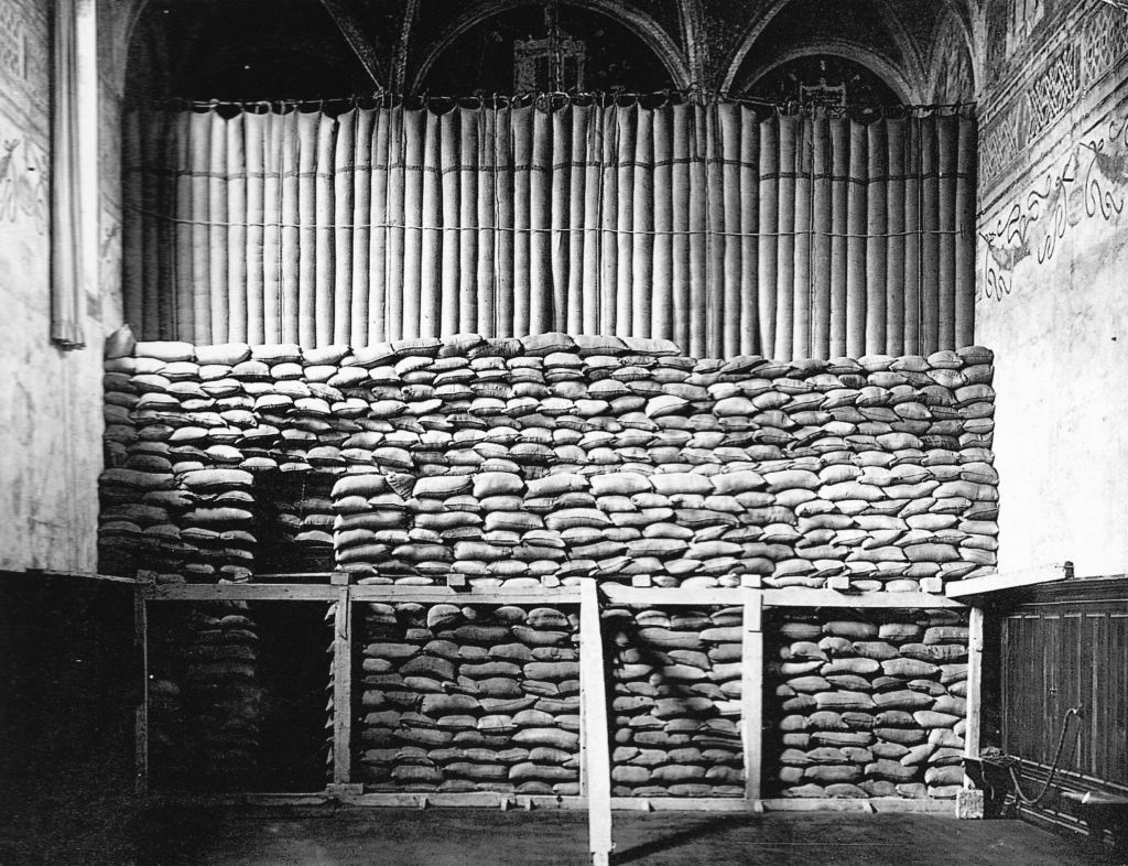 The sandbags and bracing used to successfully protect and preserve the wall of The Last Supper during the bombings of World War II are clearly shown in this photograph.