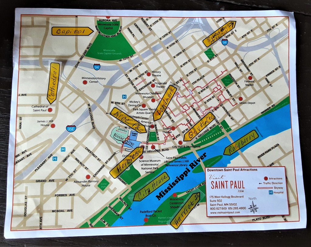 Map of downtown St. Paul with places visited on our Travel Dates and included in my blog.
