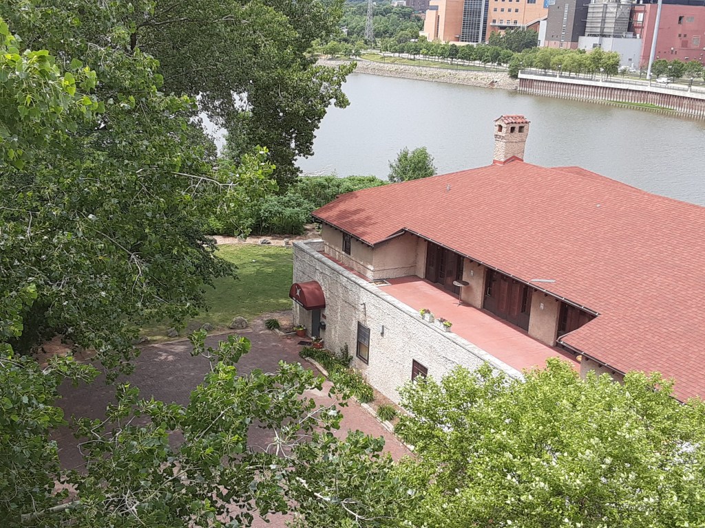 Looking west off of Wabasha Bridge – Minnesota Boat Clubhouse, main entrance. P.C. Cher B, 09 July 2021