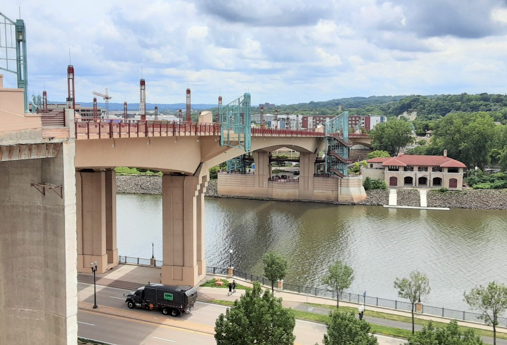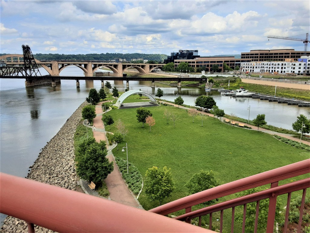 Raspberry Island, Wabasha Bridge, looking south from the 18th floor Government Center. P.C. Cher B, 09 July 2021.