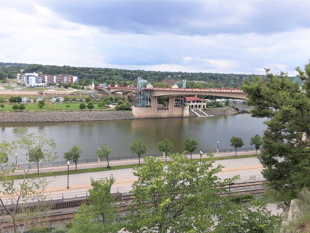 A service road from Harriet Island to Raspberry Island was provided for cars – and for the faint-of-heart-and-body who might not want to manage the 3 story flight of open stairs from the bridge!