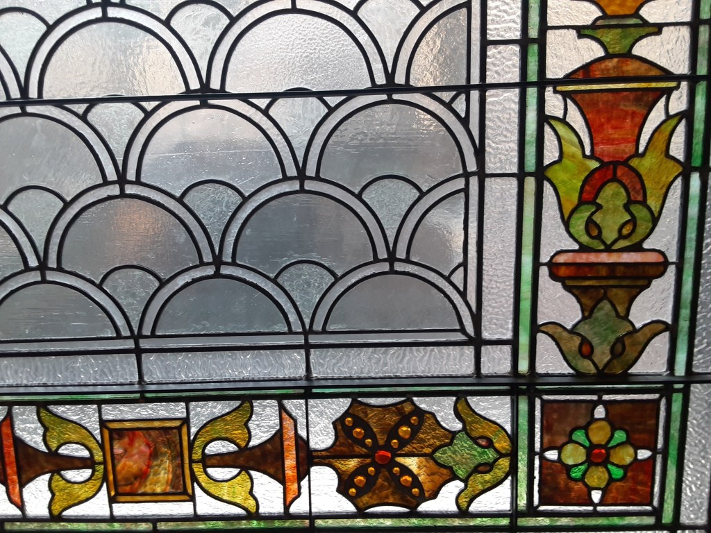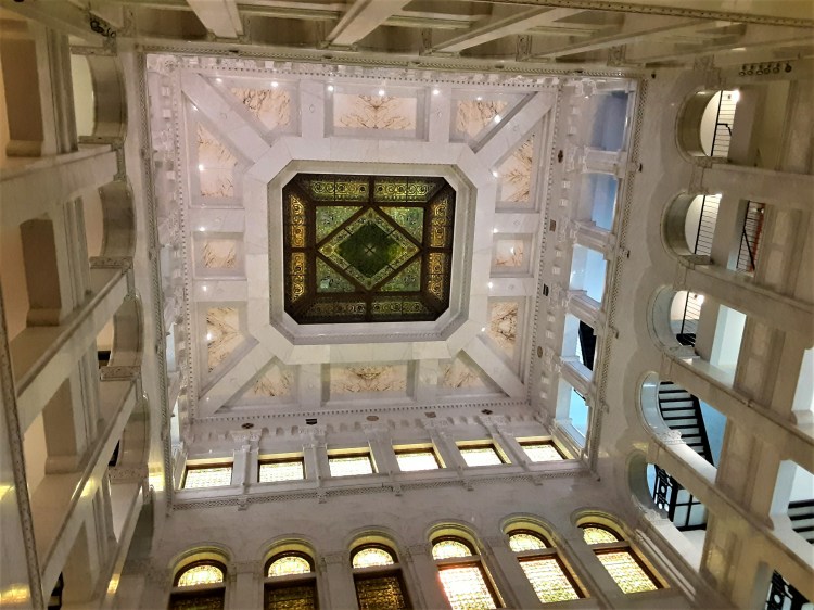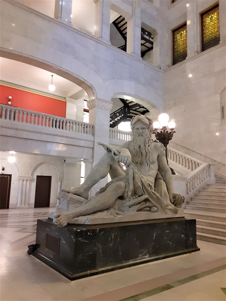 The Rotunda serves as a perfect setting for Old Man River. He is surrounded by a magnificent skylight above – I wish one could get a closer look at its intricacies – colorful stained glass windows behind it and the decorative stone floors beneath.