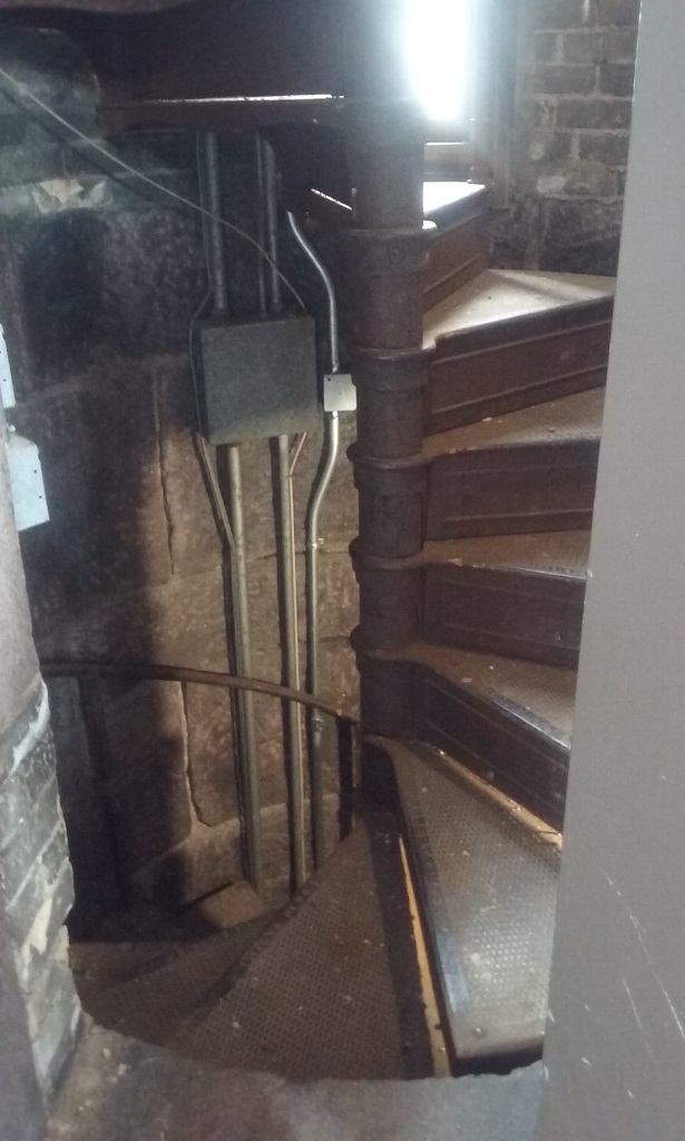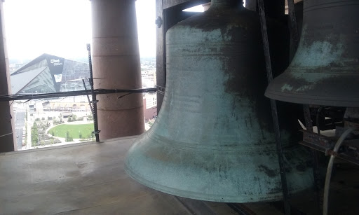 Public access to the top of the tower is not permitted. However, the passage to get there is fascinating and worth a mention! As noted in the bell tower website, to get to the bells at the top of the Minneapolis City Hall “you pass through an old vault before inching up a tiny elevator to the 13th floor of the clock tower. Step out, and you’ll find sweeping views and a set of 15 weathered bells, but you won’t find anyone ringing them. The room where someone used to play sits empty. A sheet draped over the old controls collects dust, but this tradition is not lost. For an hour every week volunteers proudly play this contraption. These 25 keys were wired to the tower bells in the 70’s making it much easier to play the bells, no longer needing to climb the 300 stairs as their predecessors did.”