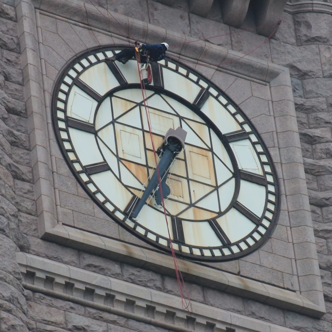Each minute hand is over 14 feet long. It was once calculated that the tip of the minute hand travels 110 miles each year. When the original backlit glass faces began to crack in 1949, a new set of metal clock faces with neon lighting was installed. (Note the perspective given by size of worker in the 12:00 position!