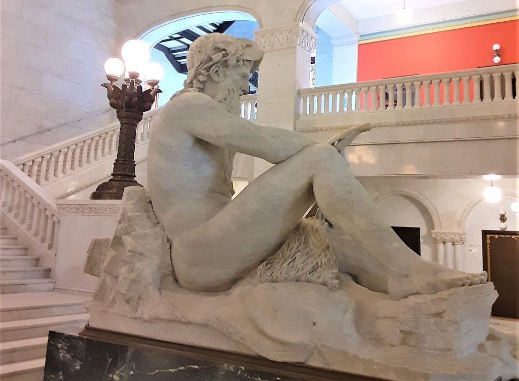 “Father of Waters” while representing an American River, is as Italian as he can be. Its American sculptor, Larkin Goldsmith, was living in Florence when he created it. It is reportedly sculpted from the largest piece of marble ever taken from the famous Italian Carrara quarries, the favorite source of marble for Italian Renaissance sculptors such as Michelangelo.