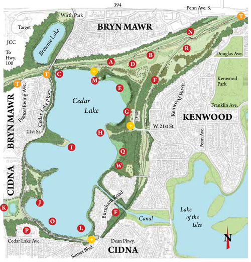 On the WEST: Cedar Lake is surrounded by parkland, along with 2 of its 3 sandy beaches.