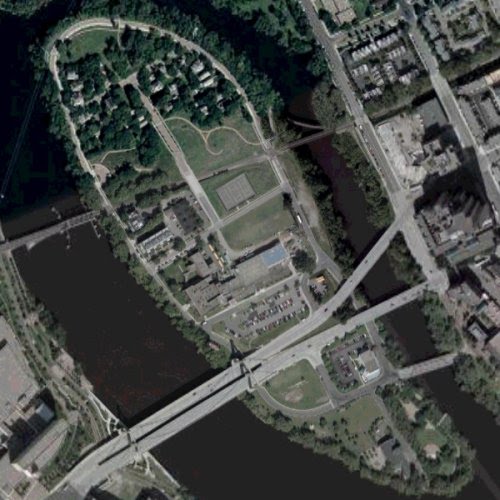 - The bridge on the lower right connects the island to St. Anthony Main.