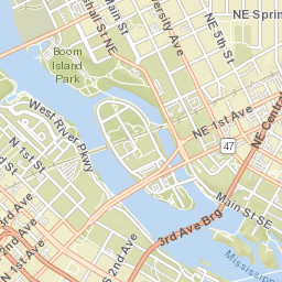 - Double bridge in the lower 1/3 of the island is the Hennepin Avenue Bridge (#47) connecting downtown (on the left) and NE Minneapolis (on the right).