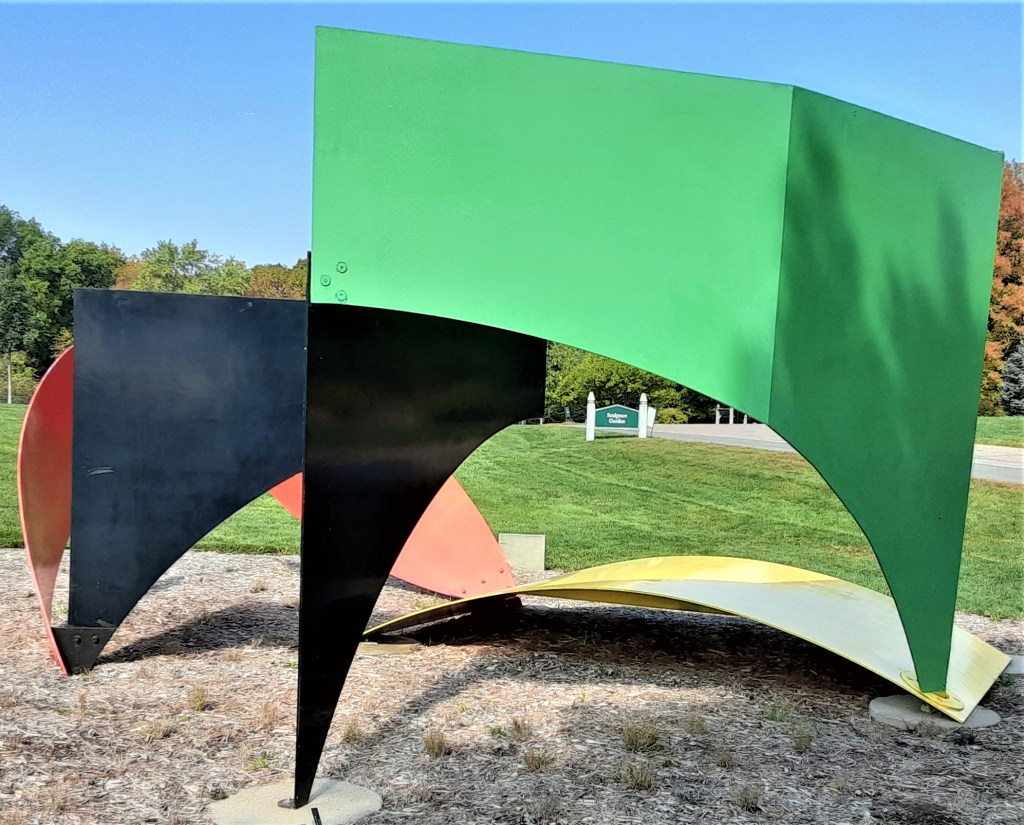 This modern Calder-style sculpture is the centerpiece and seen first as you enter the Sculpture Garden. Sign along the 3-mile drive is seen in the center.