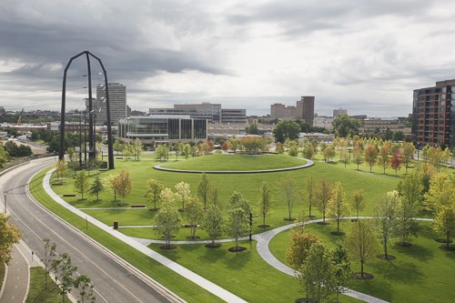 Gold Medal Park is a 7.5 acre park in the heart of the St. Anthony Falls area. It contains a 32′ tall mound whose top may be accessed by a spiral sidewalk. At the top there is seating amidst a grove of trees with good views of the Mississippi River, the historic Stone Arch Bridge, Guthrie Theater, and the historic milling district.