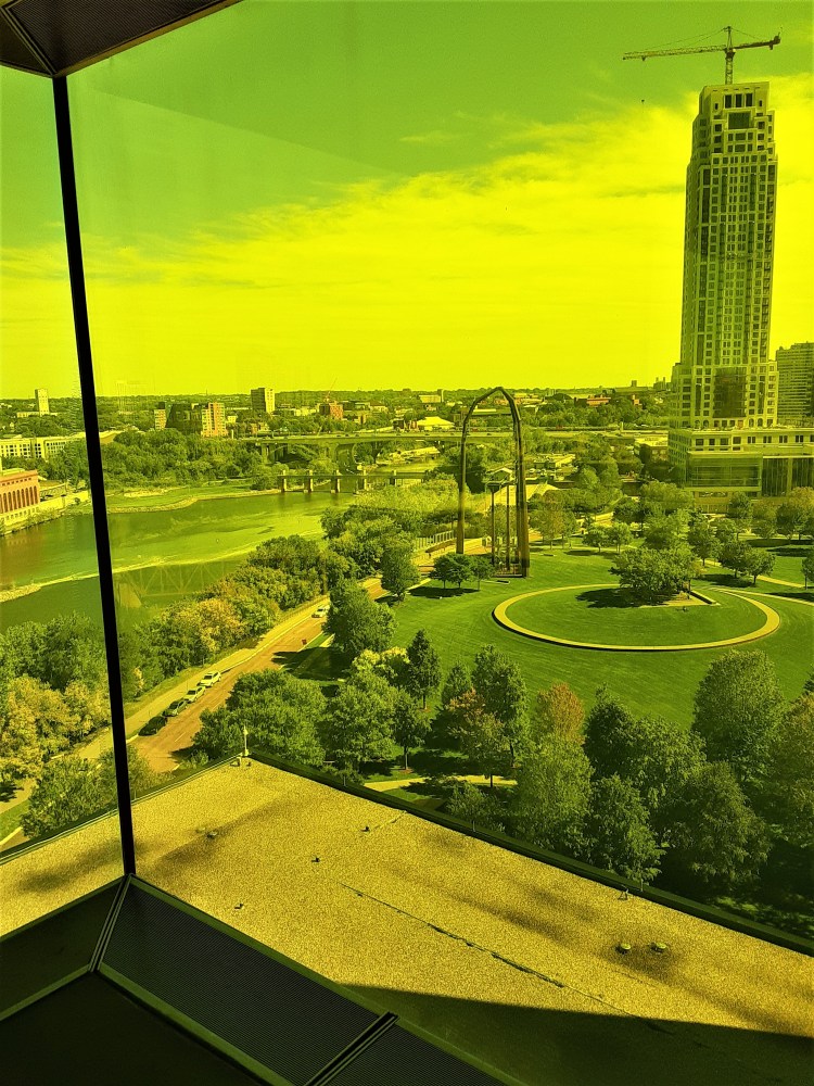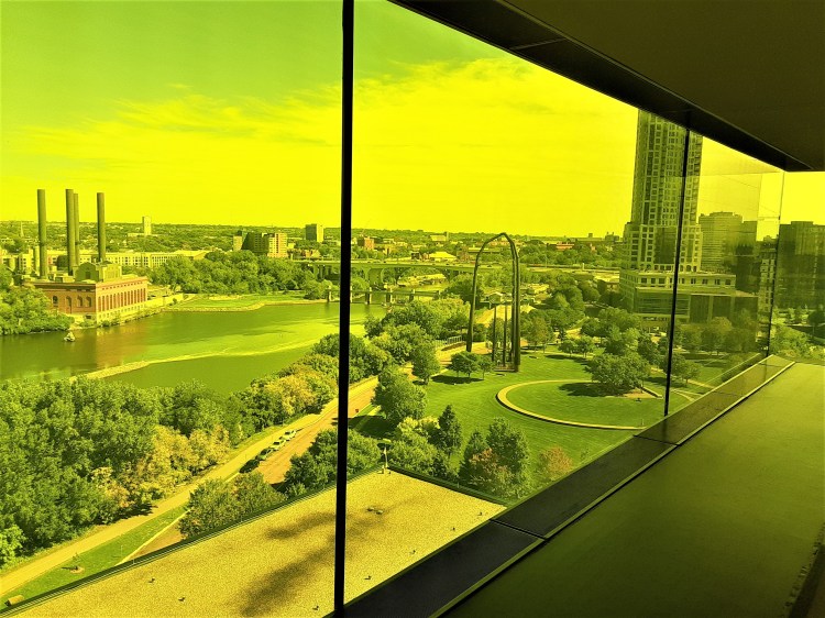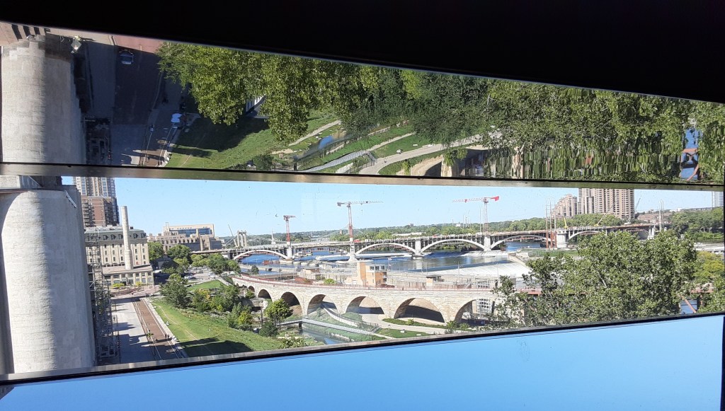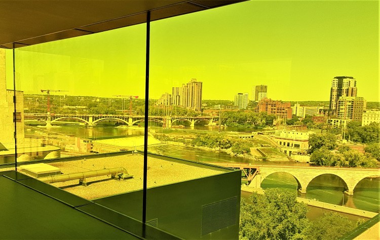 On the 9th floor of the Guthrie Theater is a fascinating cantilevered observation box made of amber/yellow colored glass windows and floor. It looks north over the Mississippi and has awesome views of the the riverfront district: Stone Arch Bridge, St. Anthony Falls, Gold Medal Park, and Hennepin Island.