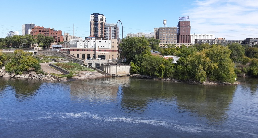 Hennepin Island is no longer an actual island – unlike Nicollet Island, its close neighbor to the north which is surrounded by water on all sides. Over time, Hennepin Island has been absorbed, at least in part, into the shoreline next to it.