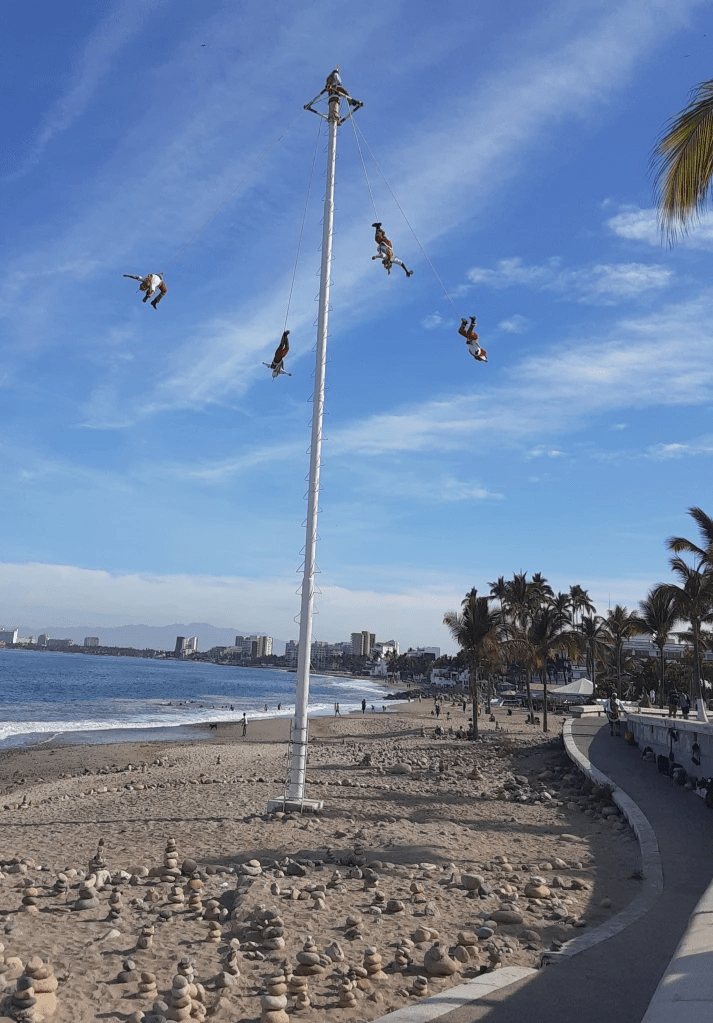 Papantla Pole Flyers performed while we walked down the Malecón . An impressive, color-filled, dangerous and ancient Mexican ritual, a priest and four flyers climb an 80-foot pole, tie themselves with ropes, and launch into the air. Originally created to ask the pre-hispanic gods to end a severe drought, today they primarily entertain.