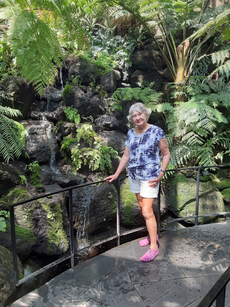 The Fern Room features a wide array of ferns among rippling water in fountains, falling down craggy rocks and shining in reflecting pools.