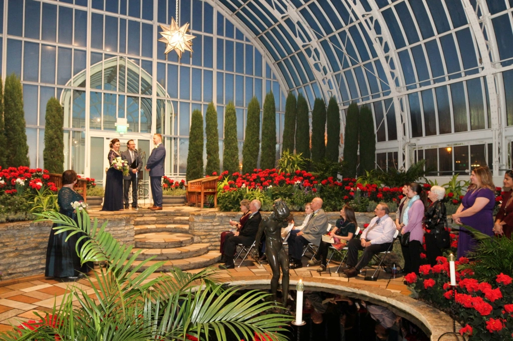 Wedding in the Sunken Garden amidst the Christmas season displays.