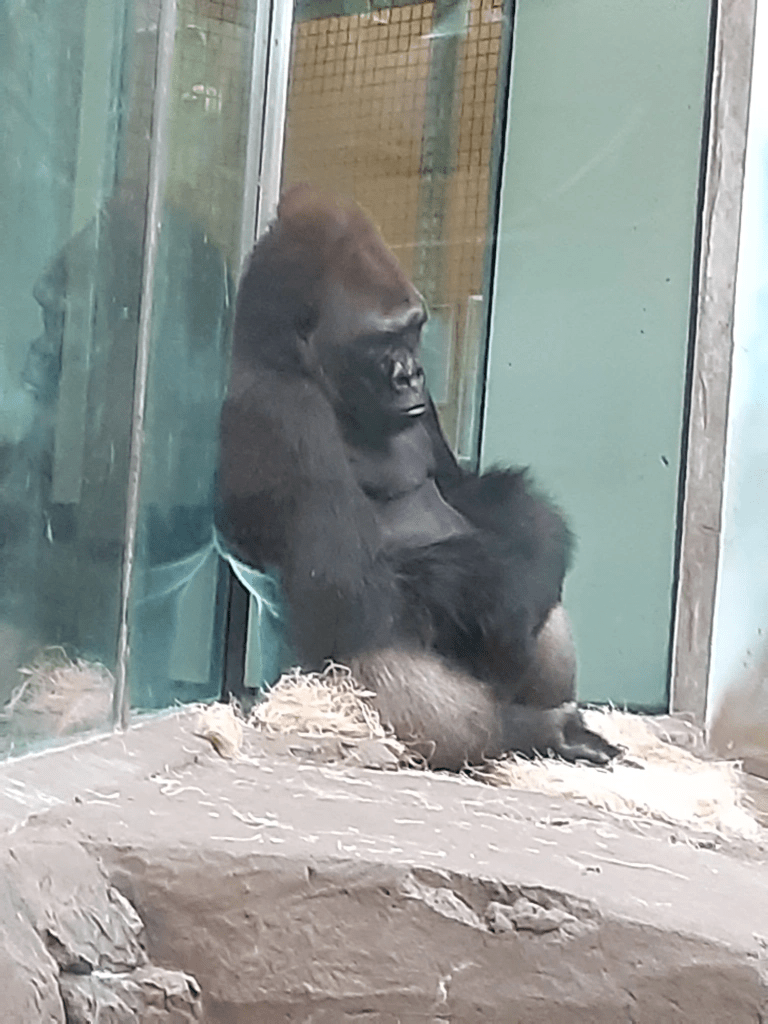 We were fascinated with the interaction with the gorilla on our visit. Like us, the hot temperatures outdoors were impacting his lack of energy as well! He leaned lethargically against the viewing window. At one point, he caught me staring at him. He looked back at me, rolled his eyes, and returned to his nap!
