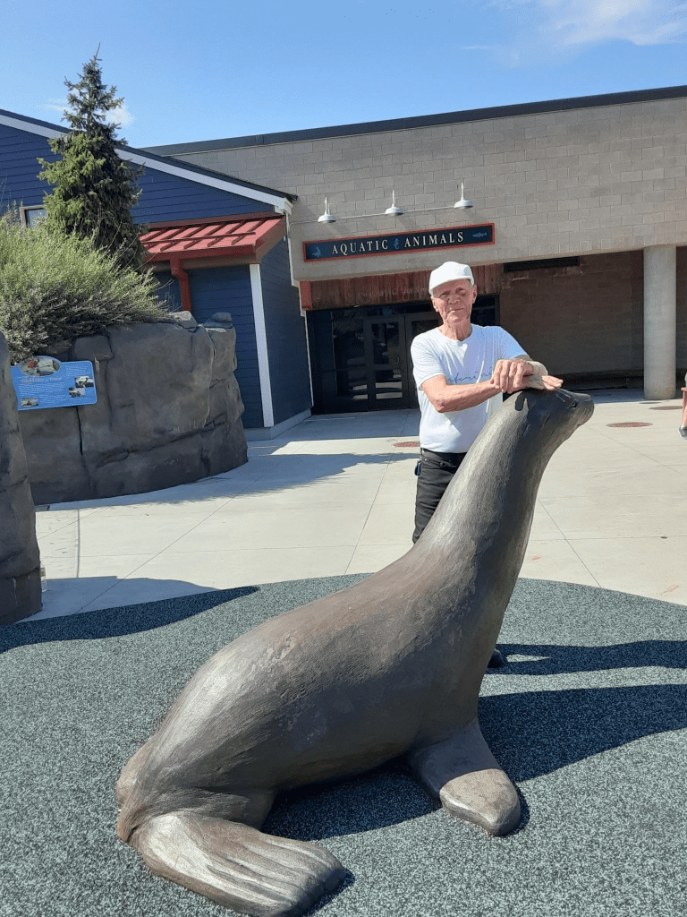 Skip with Sparky, just outside the Sparky Amphitheater. The fiberglass sculpture was created in 1997 by Third Street Studios in celebration of the zoos centennial.