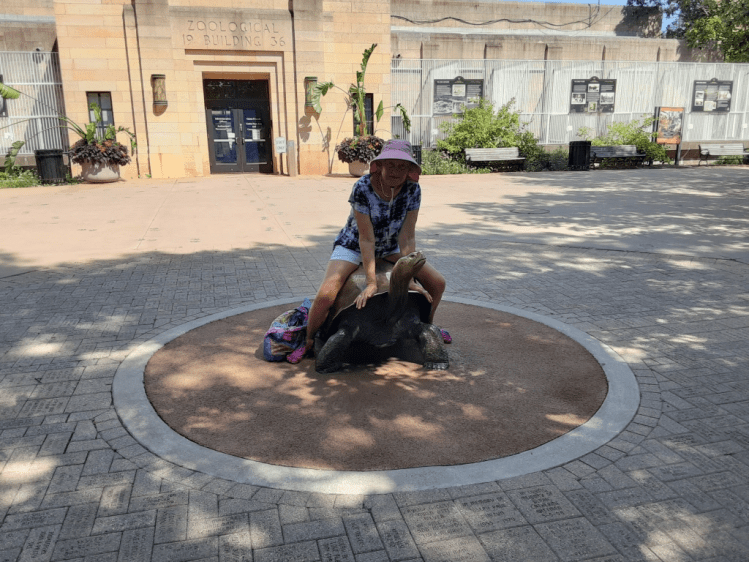 The real Galapagos Toby the Tortoise is now gone but he has been immortalized in bronze by artist Tischler. It is located in front of the original Zoological building in the Donor Plaza.