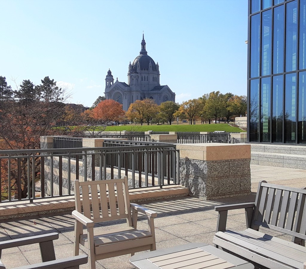 The spacious outdoor patio provides views of Cathedral Hill and downtown St. Paul.