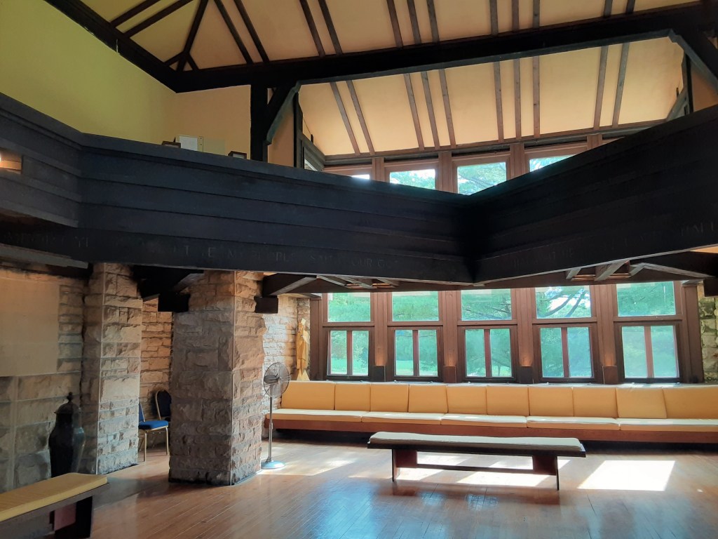 The airy, spacious Assembly Hall is an example of Wright’s strides to “destroy the box” of traditional architectural design. At one time, ferns filled the windows to bring nature into the space.