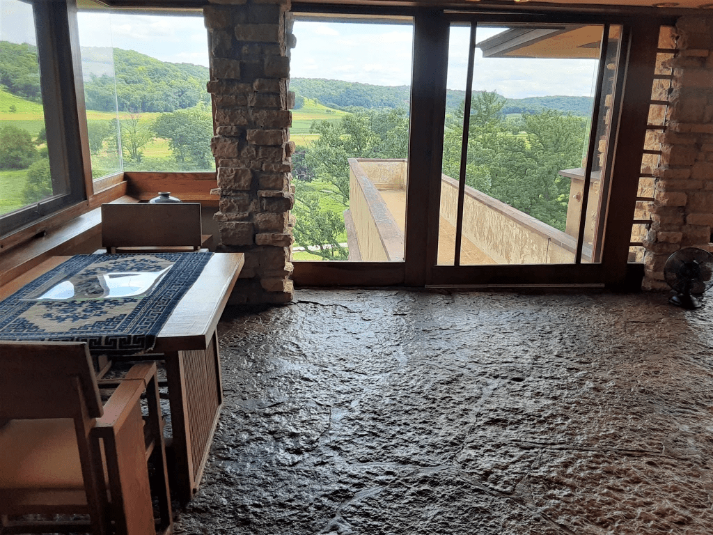 The main entry foyers was created from local Wisconsin stone. Low ceilings set the stage for the space into which one was about to experience – Wright’s Taliesin home!