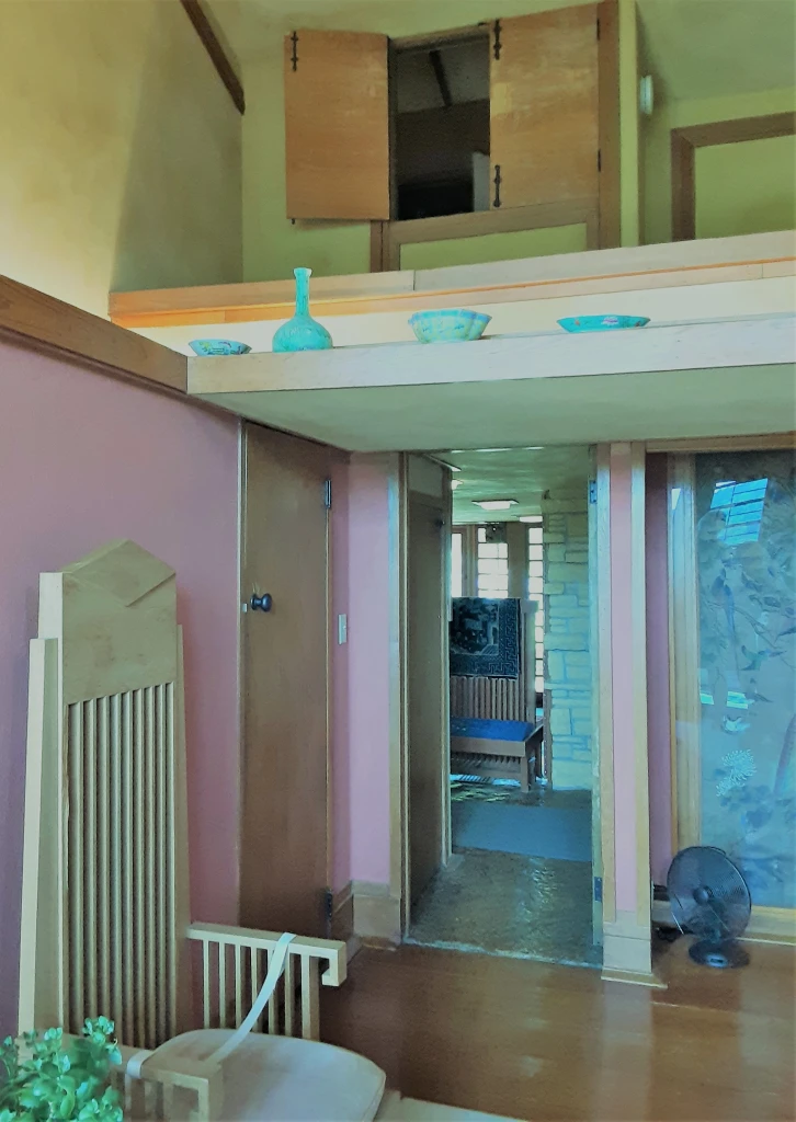 This house was out-of-the-ordinary for Wright’s typical out-of-the-box designs. Based on his design for “A Fireproof House for $5000” featured in the Ladies Home Journal article, it was sort of a “Sears Catalog” house, popular at that time. Jane wanted it just like the “pattern.” Wright wanted it more customized to fit into his vision for the whole Taliesin landscape. Happily, a compromise was reached between them.