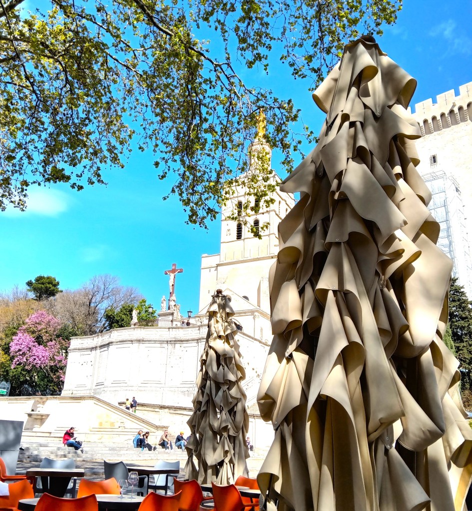 I am always on the look out for interesting shapes. These were perfect! Situated in the courtyard in front of the Papal palace, the crazy looking “sculptures” in the front and right are actually umbrellas used to cover the patio dining in the area below.