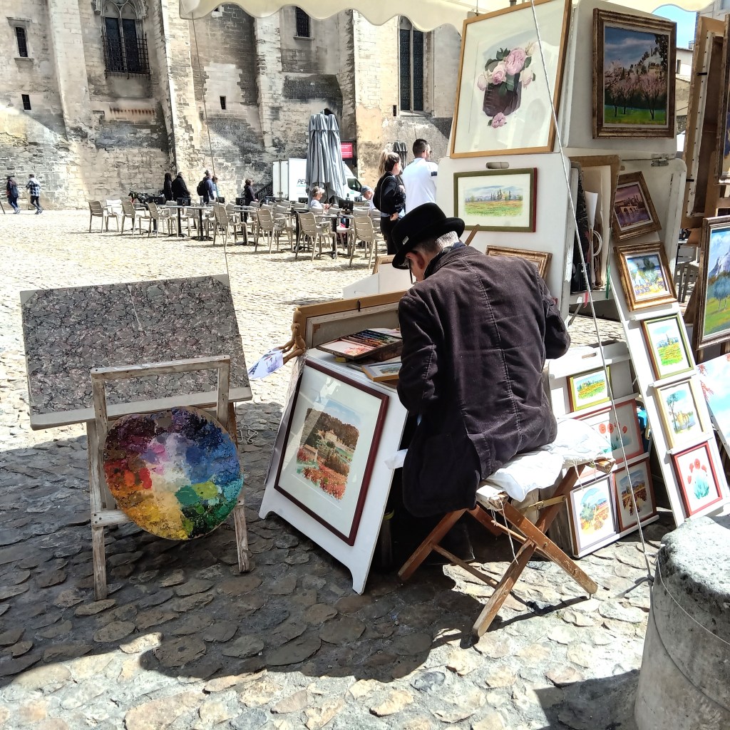 Situated on a side street, this man and his dog invited us to stop and check out at the art he had for sale. Paintings of the local architecture, scenery (cypress trees) and flowers (poppies, lavender) were common scenes.