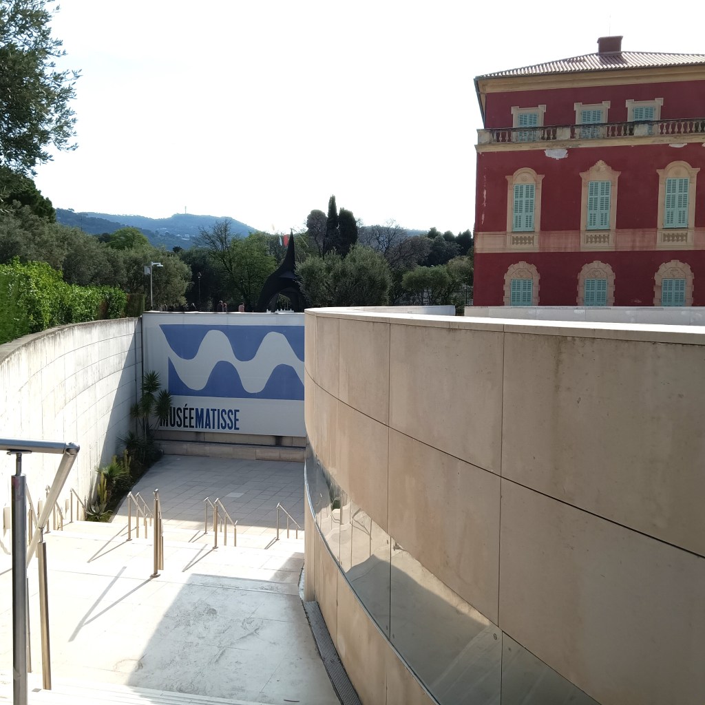 We passed the exterior of the Matisse Museum with our tour of the Cimiez hilltop on our way to the amphitheater and monastery. The museum exhibits are within the red brick building; its entry and some displays are in a contemporary lobby entrance below. That afternoon, we visited the Matisse Museum on our own.