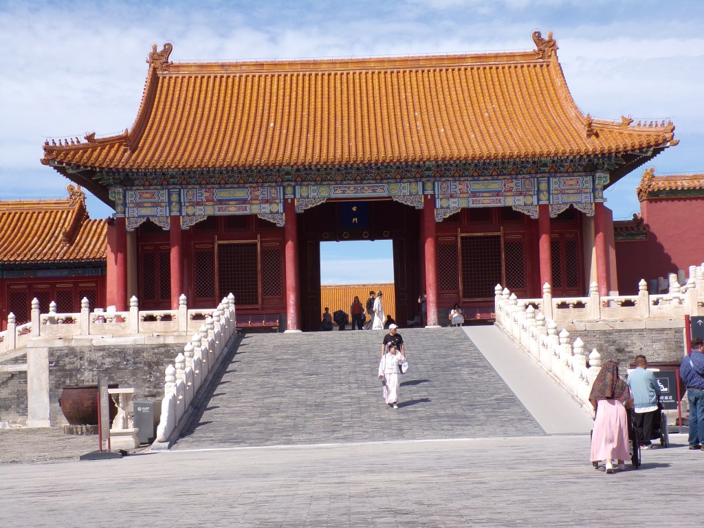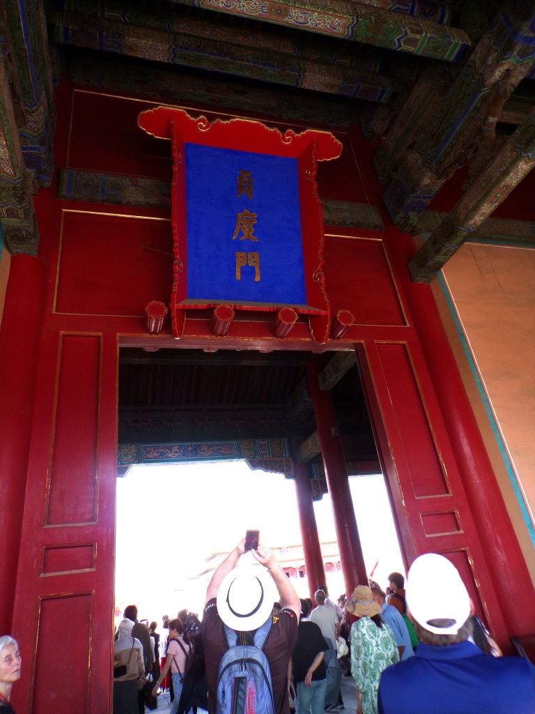 A massive entrance into the Forbidden City leads through the Outer Court (Hall of Preserving Harmony). Walls are plain but imposing – and the roof is spectacular. Security was very tight. Passports were checked along with our ticket to gain entrance. Side note: Passports were checked everywhere in China. And our visas were glued inside our passports. (And… getting a visa to China is another whole story…)