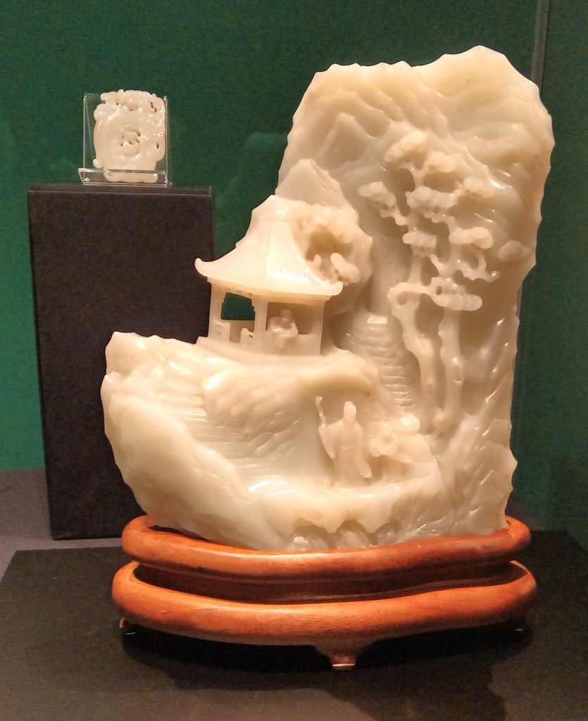 I was attracted to the museum’s “Jade Mountain” because it is a smaller version of one of my favorite “Jade Mountain” sculptures at my home museum, the Minneapolis Institute of Art. I learned that renditions of jade mountains were common items in the study of a Qing scholar. This sculpture, “Jade Mountain of a visit to friend with qin,” was also from the Palace Museum in the Forbidden City. I believe that it is a perfect piece to grace one’s study!