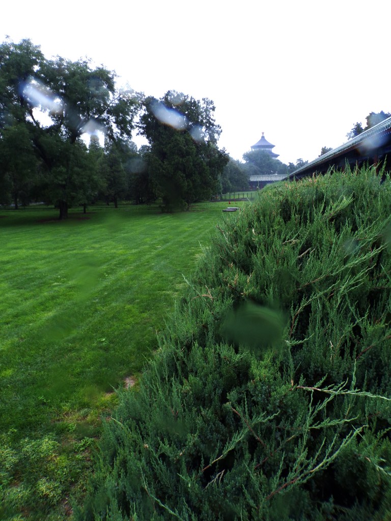 The Temple of Heaven is situated in a very spacious and lovely park that today attracts early morning practitioners of tai ji quan. The vast grounds around the complex were off-limits to the common people during the Ming and Qing dynasty. Today, it seemed off-limits to us as well. Visitors obediently followed the clearly marked paths. We were instructed to not to wander off into the grassy area (of course, not a problem in the rain!)
