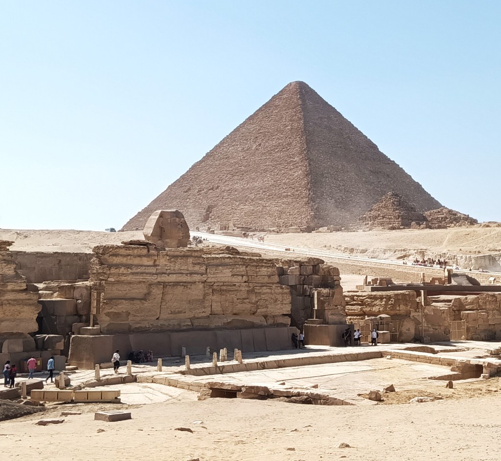 The Great Sphinx is set against the backdrop of the Great Pyramid. In front of the Great Sphinx are the remains of the Sphinx Temple which serves as the entrance to get close to the Great Sphinx.