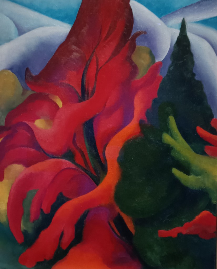The Stieglitz Lake George home was a welcoming place. The natural beauty was inspirational for O’Keeffe. Always filled with family and friends, the constant parade of people was overwhelming and distracting for her. She discovered her sanctuary in an old outbuilding she called the “shanty.” She adopted this as her peaceful, quiet place to paint without distractions. “Trees in Autumn” is a shanty painting which displays the vibrant autumn maples for which the Adirondacks are famous.