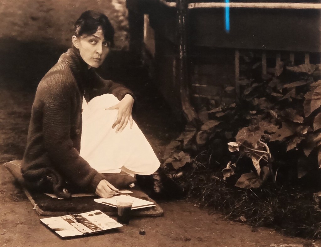 Interestingly, there are only a few photographs in which she is portrayed engaged in her artistic work. This one, a favorite of mine, is with watercolor paints. It was taken by Stieglitz at his family summer home in Lake George, New York.