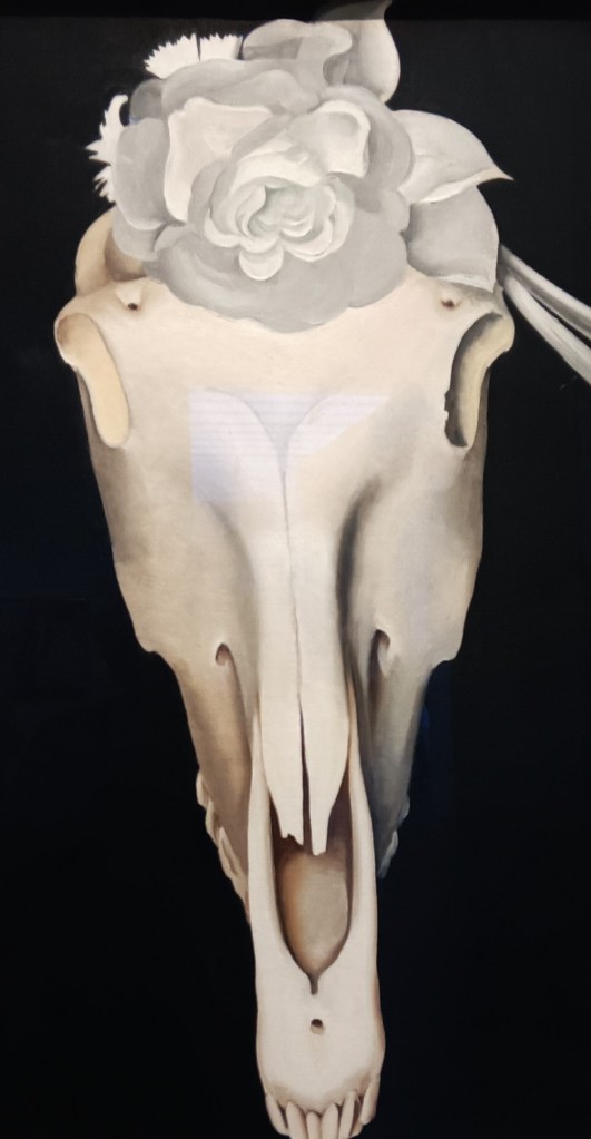“Horse’s Skull with White Rose” is one of O’Keeffe’s paintings using the intriguing combination of bleached bones and flowers.