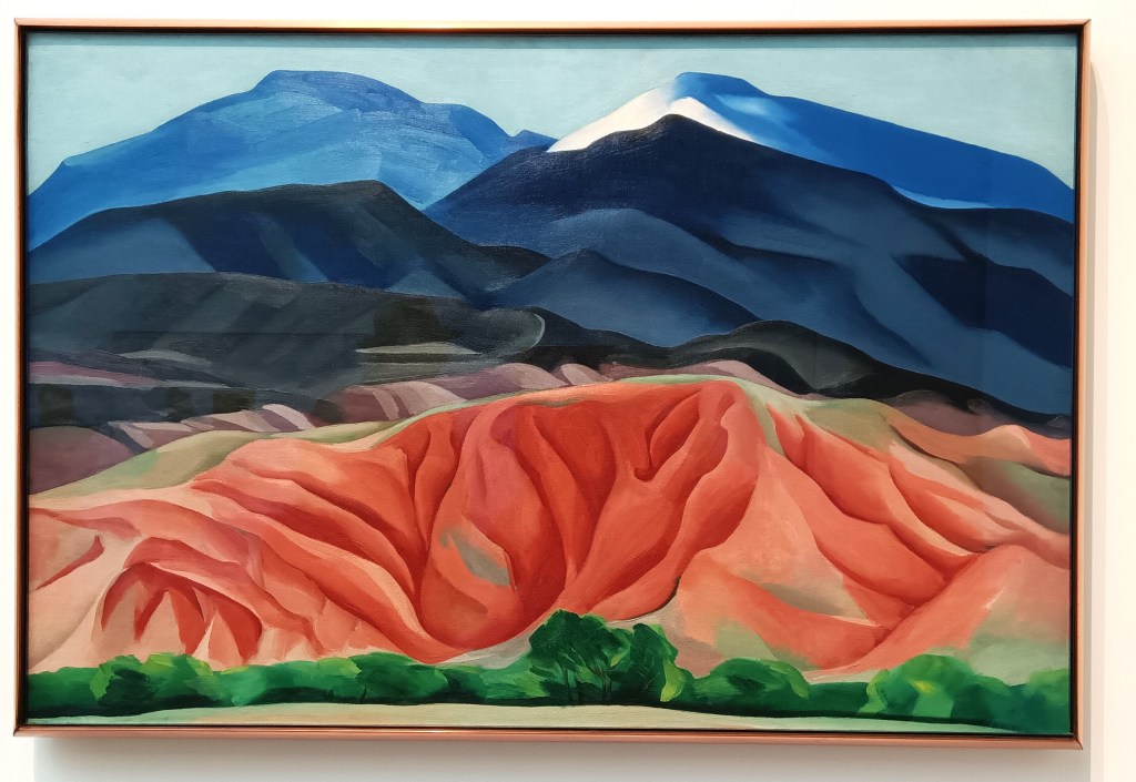 O’Keeffe spent summers with friends in Taos, New Mexico. Here she painted a series of views of the vibrantly hued hills across the Rio Grande. This one is a scene “out back” of the home of her friend, author and socialite Marie Garland.