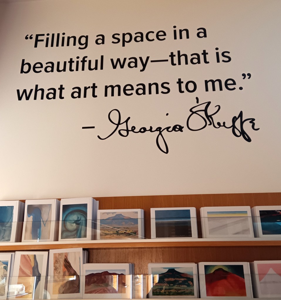 The Gift Shop was nice. Interestingly, the O’Keeffe foundation has prohibited her art from going commercial and printed on clothing and mugs, etc. My quest for a tee-shirt with one of her flowers has never been met; I could never find one…now I know why!