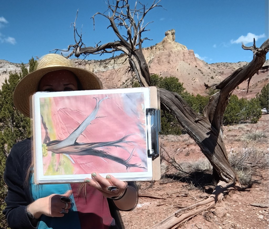 Georgia O’Keeffe’s paintings, especially those of large, abstract flowers, are some of my favorite works of art. As an educator of both art history and 2D design, her works are inspiring. It has been my long-time desire to make a pilgrimage to her home turf in New Mexico and experience the scenes she painted again and again! That dream became reality in spring 2024.